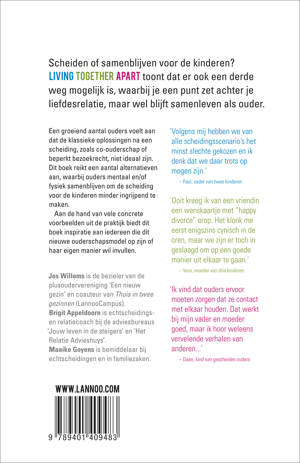 Een vernieuwend boek over samenleven na een scheiding Scheiden of samenblijven voor de kinderen? Living Together Apart toont dat er ook een derde weg mogelijk is, waarbij je een punt zet achter je liefdesrelatie, maar wel blijft samenleven als ouder. Een groeiend aantal ouders voelt aan dat klassieke oplossingen na een scheiding, zoals co-ouderschap of beperkt bezoekrecht, niet ideaal zijn. Aan de hand van voorbeelden uit de praktijk onderzoekt Living Together Apart mogelijke alternatieven, waarbij ouders mentaal en/of fysiek 'samenblijven' om de scheiding voor de kinderen minder ingrijpend te maken. Dit boek reikt een aantal alternatieven aan, waarbij ouders mentaal en/of fysiek samenblijven om de scheiding voor de kinderen minder ingrijpend te maken. Aan de hand van vele concrete voorbeelden uit de praktijk biedt dit boek inspiratie aan iedereen die dit nieuwe ouderschapsmodel op zijn of haar eigen manier wil invullen.