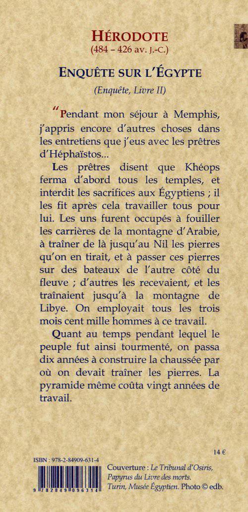 Les prêtres disent que Khéops ferma d'abord tous les temples, et interdit les sacrifices aux Égyptiens ; il les fit après cela travailler tous pour lui. Les uns furent occupés à fouiller les carrières de la montagne d'Arabie, à traîner de là jusqu'au Nil les pierres qu'on en tirait, et à passer ces pierres sur des bateaux de l'autre côté du fleuve ; d'autres les recevaient, et les traînaient jusqu'à la montagne de Libye. On employait tous les trois mois cent mille hommes à ce travail.