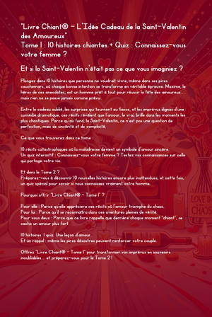 TOME 1 Chapitre 1 La Quête Épique du Cadeau Parfait pour Son Homme................................................................................14 Chapitre 2 Le Cadeau Parfait pour Sa Femme.............21 Chapitre 3 Réserver un Restaurant le Soir du 14 Février ......................................................................................................29 Chapitre 4 Le Patron Qui Oblige à Rester Plus Longtemps au Travail.............................................................37 Chapitre 5 Les Réseaux Sociaux et la Pression Romantique................................................................................46 Chapitre 6 Le Cadeau Oublié............................................56 Chapitre 7 Le Double Rencard Catastrophe.................66 Chapitre 8 La Tentative du Spa Romantique.................76 Chapitre 9 La Surprise Romantique à la Maison (Qui Tourne Mal)...............................................................................87 Chapitre 10 Le Week-end Romantique (Ou Comment Transformer une Évasion Amoureuse en Épisode de Survie).........................................................................................97 Dans ce Tome 1 : Quiz de connaissances sur votre femme........................................................................................107 Questions personnelles......................................................108 Mémoires et souvenirs.....................................................109 Humour et situations cocasses........................................110 Son quotidien et habitudes..................................................111 Épilogue ..............113