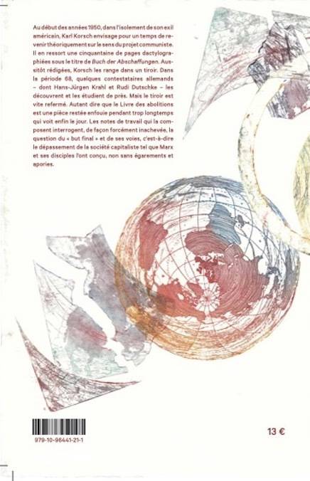 En 1950, dans l'isolement de son exil américain, Karl Korsch envisage pour un temps de revenir théoriquement sur le sens du projet communiste. Il en ressort une cinquantaine de pages dactylographiées sous le titre de Buch der Abschaffungen. Aussitôt rédigées, Korsch les pose dans un tiroir. Dans la période 68, quelques contestataires allemands - dont Hans-Jürgen Krahl et Rudi Dutschke - les découvrent et l'étudient de près. Mais le tiroir est vite refermé. Autant dire que le Livre des abolitions est un trésor resté caché pendant trop longtemps qui voit enfin le jour. Les notes de travail qui le composent interrogent, de façon forcément inachevée, la question du « but final », c'est-à-dire du dépassement radical de la société capitaliste telle que Marx et ses disciples l'ont posée, non sans égarements et apories.