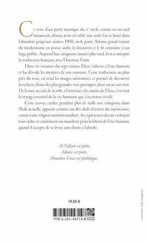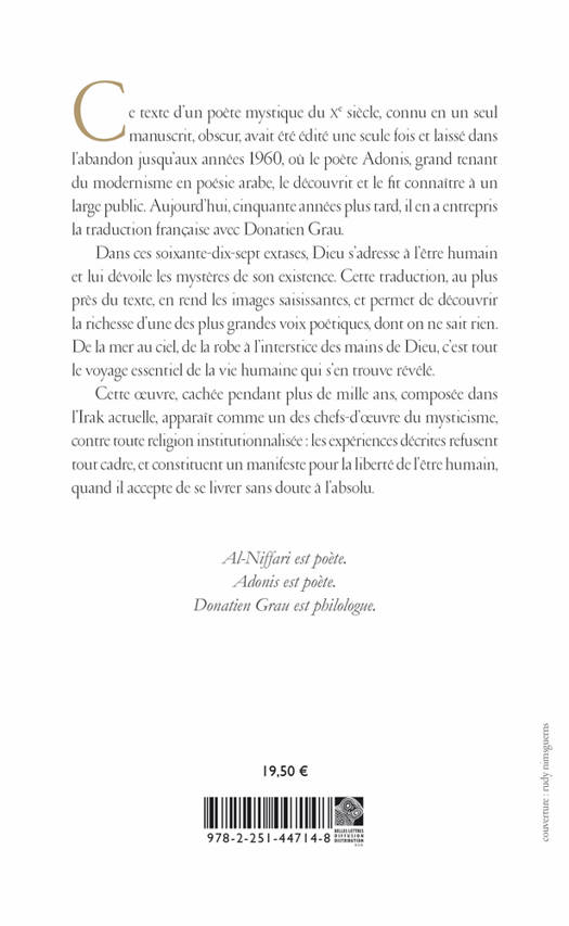 Ce texte d'un poete mystique du xe siecle, connu en un seul manuscrit, obscur, avait ete edite une seule fois et laisse dans l'abandon jusqu'aux annees 1960, ou le poete Adonis, grand tenant du modernisme en poesie arabe, le decouvrit et le fit connaitre a un large public. Aujourd'hui, cinquante annees plus tard, il en a entrepris la traduction francaise avec Donatien Grau. Dans ces soixante-dix-sept extases, Dieu s'adresse a l'etre humain et lui devoile les mysteres de son existence. Cette traduction, au plus pres du texte, en rend les images saisissantes, et permet de decouvrir la richesse d'une des plus grandes voix poetiques, dont on ne sait rien. De la mer au ciel, de la robe a l'interstice des mains de Dieu, c'est tout le voyage essentiel de la vie humaine qui s'en trouve revele. Cette oeuvre, cachee pendant plus de mille ans, composee dans l'Irak actuelle, apparait comme un des chefs-d'oeuvre du mysticisme, contre toute religion institutionnalisee: les experiences decrites refusent tout cadre, et constituent un manifeste pour la liberte de l'etre humain, quand il accepte de se livrer sans doute a l'absolu.