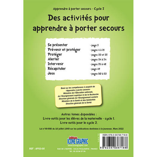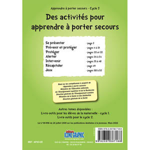 Livre-outils destiné aux activités de l'enfant du cycle 3 de la formation "Apprendre à Porter Secours". Ce livre-outil fait partie de la mallette "Apprendre à porter secours à l'école" - cycle 3. SOMMAIRE : Se présenter, Prévenir et protéger, Protéger, Alerter, Intervenir, Récapituler, Jeux // 5ème édition : mars 2022 - Format : 15 x 21 x 0,3 cm - 56 pages - Réf APS3-05
