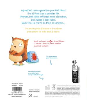 Aujourd'hui, c'est un grand jour pour Petit Hibou ! Il va à l'école pour la première fois. Pourtant, Petit Hibou préférerait rester à la maison, avec Maman et Bébé Hibou. Mais l'école lui réserve de drôles de surprises... Une histoire pleine d'humour et de tendresse pour rassurer les petits avant la rentrée.