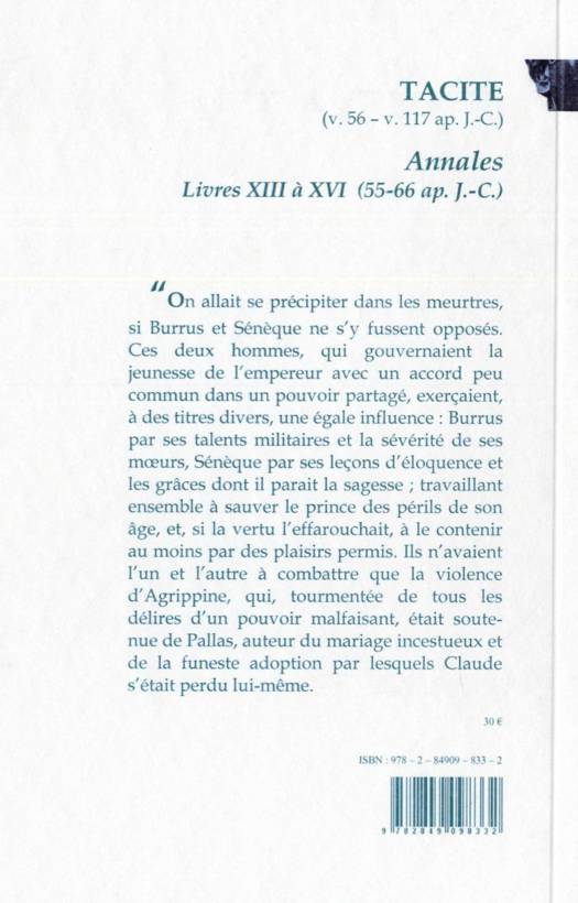« On allait se précipiter dans les meurtres, si Burrus et Sénèque ne s'y fussent opposés. Ces deux hommes, qui gouvernaient la jeunesse de l'empereur avec un accord peu commun dans un pouvoir partagé, exerçaient, à des titres divers, une égale influence : Burrus par ses talents militaires et la sévérité de ses moeurs, Sénèque par ses leçons d'éloquence et les grâces dont il parait la sagesse ; travaillant ensemble à sauver le prince des périls de son âge, et, si la vertu l'effarouchait, à le contenir au moins par des plaisirs permis. Ils n'avaient l'un et l'autre à combattre que la violence d'Agrippine, qui, tourmentée de tous les délires d'un pouvoir malfaisant, était soutenue de Pallas, auteur du mariage incestueux et de la funeste adoption par lesquels Claude s'était perdu lui-même.