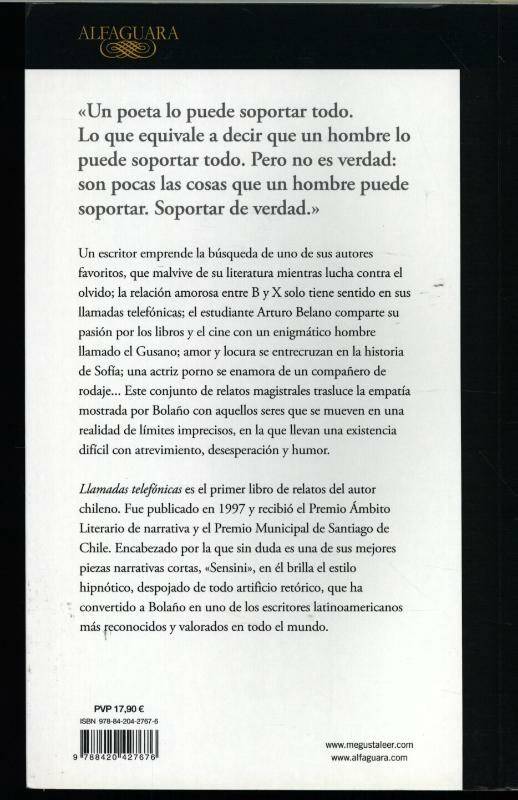 El primer libro de relatos de Roberto Bolaño, galardonado con el Premio Ámbito Literario de Narrativa y el Premio Municipal de Santiago de Chile, ahora en una nueva edición revisada. «Un poeta lo puede soportar todo. Lo que equivale a decir que un hombre lo puede soportar todo. Pero no es verdad: son pocas las cosas que un hombre puede soportar. Soportar de verdad.» Un escritor emprende la búsqueda de uno de sus autores favoritos, que malvive de su literatura mientras lucha contra el olvido; la relación amorosa entre B y X solo tiene sentido en sus llamadas telefónicas; el estudiante Arturo Belano comparte su pasión por los libros y el cine con un enigmático hombre llamado El Gusano; amor y locura se entrecruzan en la historia de Sofía; una actriz porno se enamora de un compañero de rodaje... Este conjunto de relatos magistrales trasluce la empatía mostrada por Bolaño con aquellos seres que se mueven en una realidad de límites imprecisos, en la que llevan una existencia difícil con atrevimiento, desesperación y humor. Llamadas telefónicas es el primer libro de relatos del autor chileno. Fue publicado por primera vez en 1997 y recibió el Premio Ámbito Literario de narrativa y el Premio Municipal de Santiago de Chile. Encabezado por la que sin duda es una de sus mejores piezas narrativas cortas, «Sensini», en él brilla el estilo hipnótico, despojado de todo artificio retórico, que ha convertido a Bolaño en uno de los escritores latinoamericanos más reconocidos y valorados en todo el mundo. Reseñas:«Casi todos los escritores creen ser, o quieren ser, como Roberto Bolaño: innovadores y audaces en el estilo, seductores en la narración y capaces de ser leídos y releídos; en otras palabras, excepcionales.»Scott Bryan Wilson, The Quarterly Conversation «Fue un escritor experimental que inventó formas nuevas y fue una voz muy independiente y muy crítica.»Mario Vargas Llosa «Uno de los autores más respetados e influyentes de su generación [...]. Al mismo tiempo divertido y, en cierto sentido, intensamente aterrador.»John Banville, The Nation «Bolaño ha probado que la literatura lo puede todo.»Jonathan Lethem «Se convirtió en un cuentista y novelista central, quizás el más destacado de su generación, sin duda el más original y el más infrecuente.»Jorge Edwards «Una especie de fenómeno entre Woody Allen y Lautréamont, Tarantino y Borges, un autor que conseguía que su lector se convirtiera en un frenético proselitista [...]. El único homenaje será leerle de ahora en adelante y reírnos todavía con él.»Fabrice Gabriel, Los Inrockuptibles «Bolaño experimentó la intensidad incomparable de escribir no una obra maestra sino más de una. Nadie que yo haya conocido sabía mejor que Bolaño que para un escritor no hay ningún éxito que pueda ni remotamente compararse a ése.»Javier Cercas