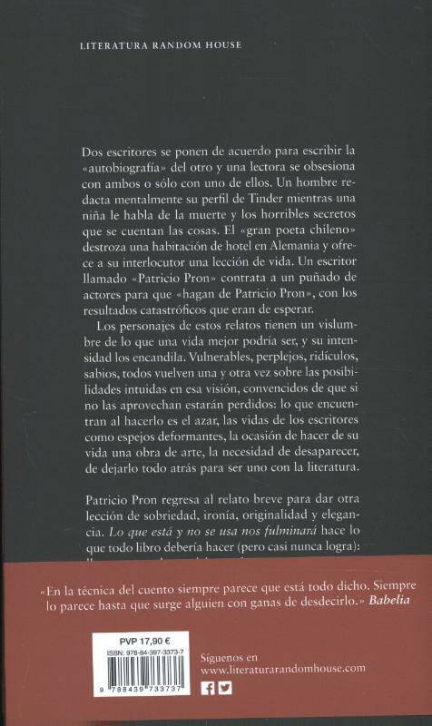 Patricio Pron regresa al relato breve para dar otra lección de sobriedad, ironía, originalidad y elegancia. Lo que está y no se usa nos fulminará hace lo que todo libro debería hacer (pero casi nunca logra): llevarte a un lugar del que desearías no tener que regresar nunca. Dos escritores se ponen de acuerdo para escribir la «autobiografía» del otro y una lectora se obsesiona con ambos o solo con uno de ellos. Un hombre redacta mentalmente su perfil de Tinder mientras una niña le habla de la muerte y los horribles secretos que se cuentan las cosas. El «gran poeta chileno» destroza una habitación de hotel en Alemania y ofrece a su interlocutor una lección de vida. Un escritor llamado «Patricio Pron» contrata a un puñado de actores para que «hagan de Patricio Pron», con los resultados catastróficos que eran de esperar. Los personajes de Lo que está y no se usa nos fulminará tienen un vislumbre de lo que una vida mejor podría ser, y su intensidad los encandila. Vulnerables, perplejos, ridículos, sabios, todos vuelven una y otra vez sobre las posibilidades intuidas en esa visión, convencidos de que si no las aprovechan estarán perdidos: lo que encuentran al hacerlo es el azar, las vidas de los escritores como espejos deformantes, la ocasión de hacer de su vida una obra de arte, la necesidad de desaparecer, de dejarlo todo atrás para ser uno con la literatura. «Patricio Pron escribe con inteligencia, talento, irreverencia, humor, voluntad política y autoridad.» Stavanger Aftenblad Críticas:«Más allá del brillante y convincente ejercicio literario, Pron narra con la autenticidad de quien sacude al lector desde una voz absolutamente propia, algo a lo que nos ha ido acostumbrando con sus poderosas novelas y relatos.»El Cultural «Muestra de forma convincente (a la vez que explora) el poder que posee la ficción para descubrir las verdades emocionales más profundamente enterradas.»The Independent «Pron incendia la República de las Letras y reflexiona con una lucidez poco corriente sobre cómo debemos dialogar con determinados textos, se pregunta por cómo leer o a quién pertenece la literatura: ¿al que produce el texto o al que lo lee?»El Periódico «Lo que está haciendo con su obra, [...] es reinventar la narrativa en castellano, contar cosas que nunca se contaron antes en nuestra lengua.»Estado Crítico «Un autor en su plenitud, dominando su oficio y levantando con un esfuerzo descomunal (pero también con la facilidad y la alegría que da ser dueño y consciente del propio talento) una obra redonda.»Sergio del Molino «En la técnica del cuento siempre parece que está todo dicho. Siempre lo parece hasta que surge alguien con ganas de desdecirlo.»Babelia