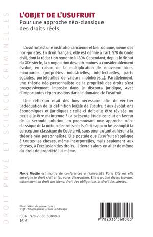 L'usufruit est une institution ancienne et bien connue, même des non-juristes. En droit français, elle est définie à l'art. 578 du Code civil, dont la rédaction remonte à 1804. Cependant, depuis le début du XIXe siècle, la composition des patrimoines a considérablement évolué, en raison de la multiplication de nouveaux biens incorporels (propriétés industrielles, intellectuelles, parts sociales, portefeuilles de valeurs mobilières...). Parallèlement, une théorie néo-personnaliste de la propriété des droits s'est progressivement imposée dans le discours juridique, avec d'importantes répercussions dans le domaine de l'usufruit. Une réflexion était dès lors nécessaire afin de vérifier l'adéquation de la définition légale de l'usufruit aux évolutions économiques et juridiques: celle-ci doit-elle être révisée ou peut-elle être maintenue ? La présente étude conclut en faveur de la seconde solution, en promouvant une approche néoclassique de la notion de droits réels. Cette approche assouplit la conception classique du Code civil, sans pour autant adhérer à la théorie néo-personnaliste. Elle postule que l'usufruit s'applique à toutes les choses, même incorporelles, mais seulement aux choses, à l'exclusion des droits. Il devrait alors en aller de même du droit de propriété lui-même.