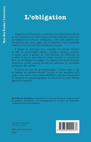 Frappé d’une illumination, le président de la République décide un soir d’automne de rendre le baccalauréat obligatoire pour tous les habitants de la France. L’Obligation, c’est cette exigence d’un tel diplôme pour tous, gage pour le Président d’une prospérité inédite et d’une attractivité nouvelle pour le pays. À travers la chronique d’un conseiller du premier ministre et celle de personnages simples, ouvriers, paysans, artisans, le roman conte la genèse de cette décision, les difficultés de sa mise en œuvre pour tester le niveau scolaire et culturel des gens, les formations envisagées, les espoirs mais aussi les fortes résistances qu’elle suscite, les dérives politiques et criminelles auxquelles elle conduit. À travers les yeux de ses personnages, il donne aussi à voir un tableau du système éducatif français et des questions qu’il pose à ceux qui en ont le moins bénéficié. Jusqu’au dénouement où l’emporte la volonté populaire de s’instruire en toute liberté, égalité et fraternité.