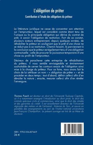 La littérature juridique ne cesse de concentrer son attention sur l'emprunteur, lequel est considéré comme étant tenu de l'unique ou la principale obligation qui dérive du contrat de prêt, à savoir l'obligation de restitution. Fort de ce constat, plusieurs auteurs entreprennent, depuis quelques années, de réhabiliter le prêteur en soulignant que le prêt d'une chose ne se réduit pas à sa restitution. Chemin faisant, ils parviennent à la conclusion que le prêteur est également tenu d'une obligation contractuelle: celle de procurer la jouissance temporaire d'une chose au profit de l'emprunteur. Désireux de parachever cette entreprise de réhabilitation du prêteur, il nous semble envisageable et éminemment souhaitable de cerner les contours exacts de l'obligation ainsi mise à la charge du prêteur. Pour ce faire, nous avons fait le choix de lui attribuer un nom - obligation de prêter - et de procéder en deux temps: tout d'abord, définir celle-ci afin d'en dévoiler la nature; ensuite, mesurer celle-ci afin d'en révéler l'envergure.