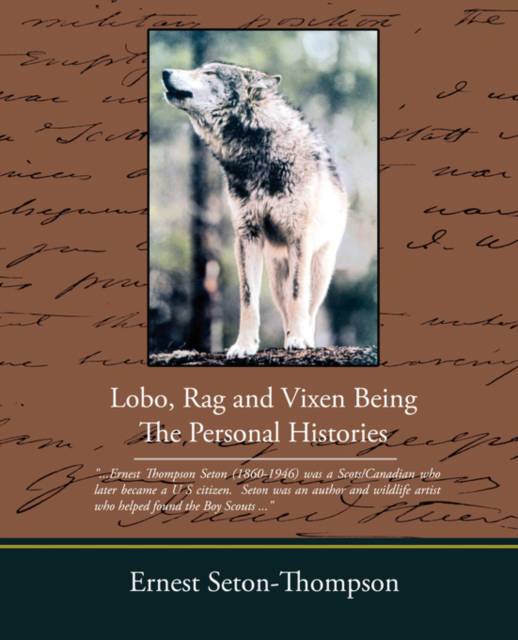 Ernest Thompson Seton (1860-1946) was a Scots/Canadian who later became a U S citizen. Seton was an author and wildlife artist who helped found the Boy Scouts of America. His notable books related to Scouting include The Birch Bark Roll and The Boy Scout Handbook. Seton is responsible for the inclusion of American Indian culture in the Boy Scout program. Lobo, Rag and Vixen Being The Personal Histories Of Lobo, Redruff, Raggylug & Vixen begins with a note to the reader which says, "These Stories, selected from those published in "Wild Animals I Have Known," are true histories of the animals described, and are intended to show how their lives are lived. Though the lower animals have no language in the full sense as we understand it, they have a system of sounds, signs, touches, tastes, and smells that answers the purpose of language, and I merely translate this, when necessary, into English."