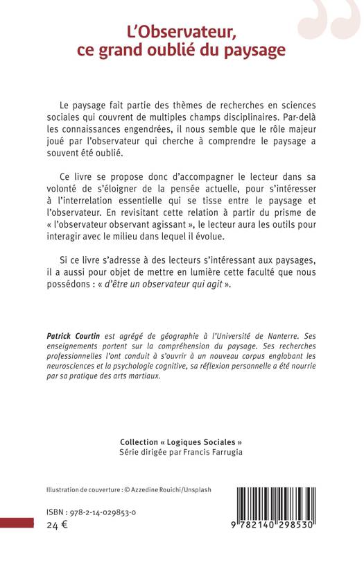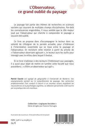 Le paysage fait partie des thèmes de recherches en sciences sociales qui couvrent de multiples champs disciplinaires (géographie, histoire, sociologie, économie, écologie etc.). Par de là les connaissances engendrées, il nous semble que le rôle majeur joué par l'observateur qui cherche à comprendre le paysage a souvent été oublié, ignoré ou tout simplement délaissé. Ce livre se propose donc d'accompagner le lecteur dans sa volonté de s'éloigner de la pensée actuelle, pour s'intéresser à l'interrelation essentielle qui se tisse entre le paysage (objet) et l'observateur (sujet). En revisitant cette relation à partir du prisme de l'observateur observant agissant, le lecteur aura les outils pour interagir avec le milieu dans lequel il évolue. Si ce livre s'adresse à des étudiants et à des professionnels s'intéressant aux paysages, il a aussi pour objet de mettre en lumière cette faculté que nous possédons tout au fond de nous-même: d'être un observateur qui agit .