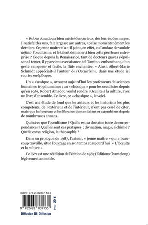 Un « classique », avouent aujourd'hui les professeurs de sciences humaines ; un « classique » pour les occultistes depuis qu'en 1950, Robert Amadou voulut rendre l'Occulte à la culture, avec un livre d'ensemble. Ce livre, ce « classique », le voici enfin réédité. C'est une étude de fond que les auteurs et les historiens les plus compétents, de l'extérieur et de l'intérieur, n'ont pas cessé de citer, mais que les lecteurs et les libraires demandaient et attendaient depuis de nombreuses années.