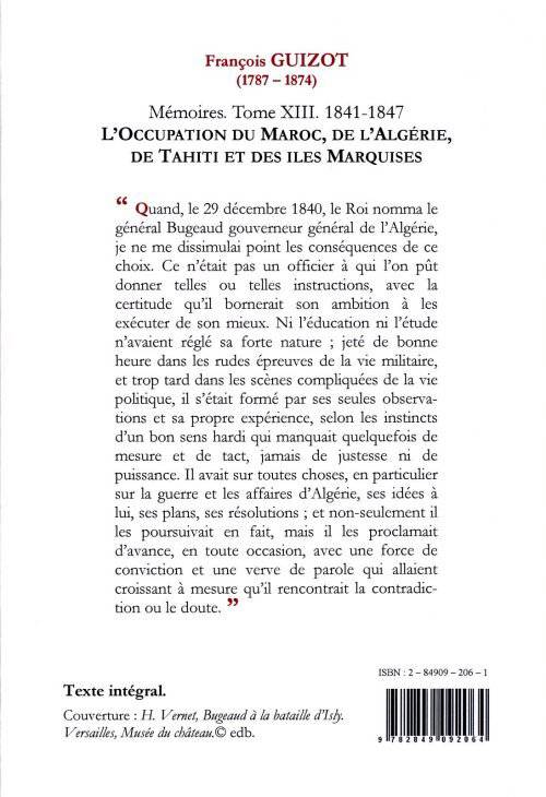 « Quand, le 29 décembre 1840, le Roi nomma le général Bugeaud gouverneur général de l'Algérie, je ne me dissimulai point les conséquences de ce choix. Ce n'était pas un officier à qui l'on pût donner telles ou telles instructions, avec la certitude qu'il bornerait son ambition à les exécuter de son mieux. Ni l'éducation ni l'étude n'avaient réglé sa forte nature ; jeté de bonne heure dans les rudes épreuves de la vie militaire, et trop tard dans les scènes compliquées de la vie politique, il s'était formé par ses seules observations et sa propre expérience, selon les instincts d'un bon sens hardi qui manquait quelquefois de mesure et de tact, jamais de justesse ni de puissance. Il avait sur toutes choses, en particulier sur la guerre et les affaires d'Algérie, ses idées à lui, ses plans, ses résolutions ; et non-seulement il les poursuivait en fait, mais il les proclamait d'avance, en toute occasion, avec une force de conviction et une verve de parole qui allaient croissant à mesure qu'il rencontrait la contradiction ou le doute. »