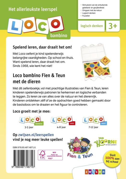 Met dit vrolijke oefenboekje kunnen peuters en kleuters lekker puzzelen. Spelenderwijs herkennen ze patronen en leggen ze logische verbanden. Al spelend leren kinderen bovendien van alles over de natuur en het dierenrijk. De prachtige illustraties van Fien & Teun op hun avonturenboerderij maken er een kleurrijk geheel van en prikkelen de fantasie. Kinderen ontdekken zélf of ze de opdrachten goed hebben gemaakt door de basisdoos om te draaien en het figuur te controleren. Spelend leren, daar draait het om bij Loco!