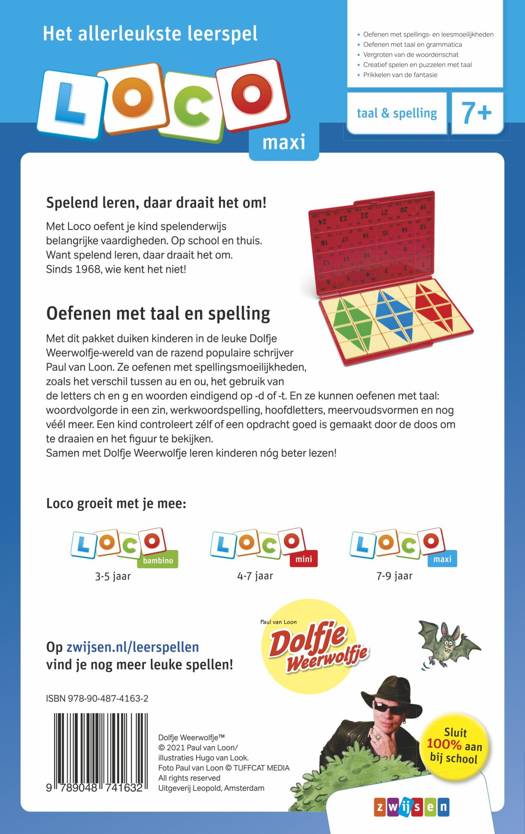 Met dit pakket oefenen kinderen spelenderwijs met taal en spelling. Samen met Dolfje Weerwolfje leren kinderen nog beter lezen en oefenen ze spellingsmoeilijkheden zoals bijvoorbeeld het verschil tussen au en ou, de klank nk en ng en het onderscheid tussen woorden eindigend op -tie en -sie. De Dolfje wereld uit de boeken van de razend populaire schrijver Paul van Loon prikkelt bovendien de fantasie. Met de Loco maxi basisdoos en de twee oefenboekjes kunnen kinderen creatief puzzelen met taal. Zijn de opdrachten goed gemaakt? Draai de doos om … en je weet het!