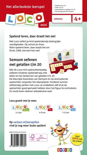 Met dit Loco mini opdrachtenboekje oefenen kinderen spelenderwijs met tellen en het herkennen van getallen t/m 20. De kleurrijke illustraties van Semsom en de afwisselende opdrachten vergroten het rekenplezier. Kinderen kunnen zelfstandig werken met Loco: ze ontdekken zélf of ze de opdrachten goed gemaakt hebben door het figuur te controleren. Zo wordt leren rekenen alles behalve saai!