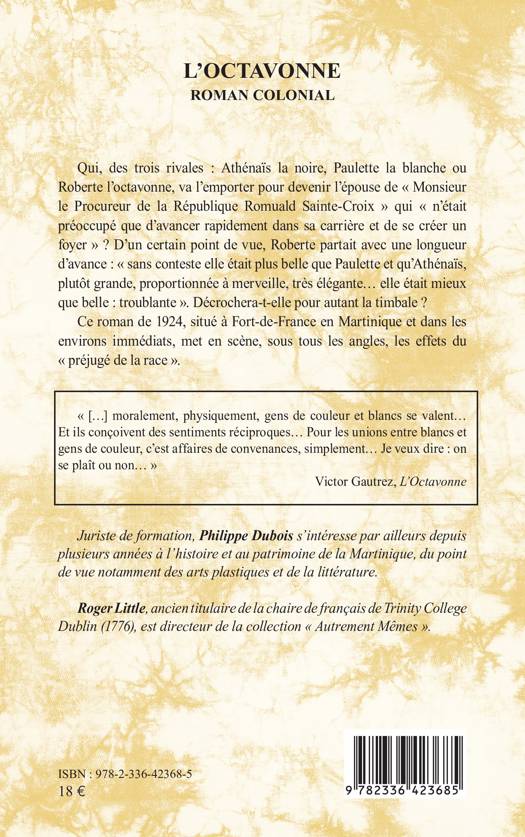 Qui, des trois rivales: Athénaïs la noire, Paulette la blanche ou Roberte l'octavonne, va l'emporter pour devenir l'épouse de Monsieur le Procureur de la République Romuald Sainte-Croix qui n'était préoccupé que d'avancer rapidement dans sa carrière et de se créer un foyer D'un certain point de vue, Roberte partait avec une longueur d'avance: sans conteste elle était plus belle que Paulette et qu'Athénaïs, plutôt grande, proportionnée à merveille, très élégante... elle était mieux que belle: troublante . Décrochera-t-elle pour autant la timbale ?