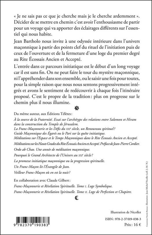 « Je ne sais pas ce que je cherche mais je le cherche ardemment. » Décider de se mettre en chemin c'est avoir l'enthousiasme de partir pour un voyage qui va apporter des éclairages différents sur l'essentiel qui nous habite. Jean Bartholo nous invite à une odyssée intérieure dans l'univers maçonnique à partir des points clef du rituel de l'initiation puis de ceux de l'ouverture et de la fermeture d'une loge du premier degré au Rite Écossais Ancien et Accepté. L'entrée dans ce parcours initiatique est le début d'un long voyage car il est sans fin. On ne peut faire le tour du mystère maçonnique, ni l'appréhender dans son ensemble, ou le saisir une fois pour toutes, pour la simple raison que nous nous sentons progressivement intégrés et avons le sentiment de redécouvrir à chaque fois l'itinéraire proposé. C'est le propre de la tradition plus on progresse sur le chemin plus il nous illumine.