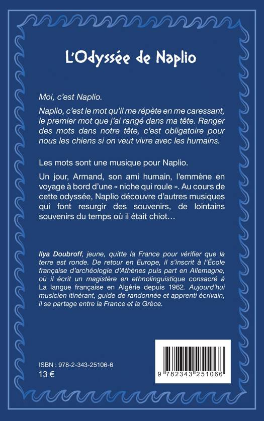 Moi, c’est Naplio. Naplio, c’est le mot qu’il me répète en me caressant, le premier mot que j’ai rangé dans ma tête. Ranger des mots dans notre tête, c’est obligatoire pour nous les chiens si on veut vivre avec les humains.Les mots sont une musique pour Naplio.Un jour, Armand, son ami humain, l’emmène en voyage à bord d’une « niche qui roule ». Au cours de cette odyssée, Naplio découvre d’autres musiques qui font resurgir des souvenirs, de lointains souvenirs du temps où il était chiot.
