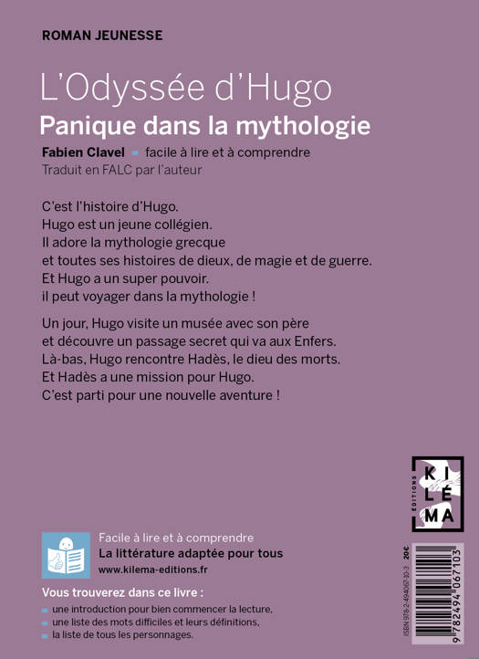 UN LIVRE FACILE À LIRE ET À COMPRENDRE ! C'est l'histoire d'Hugo. Hugo est un jeune collégien. Il adore la mythologie grecque et toutes ses histoires de dieux, de magie et de guerre. Et Hugo a un super pouvoir : il peut voyager dans la mythologie ! Un jour, Hugo visite un musée avec son père et découvre un passage secret qui va aux Enfers. Là-bas, Hugo rencontre Hadès, le dieu des morts. Et Hadès a une mission pour Hugo. C'est parti pour une nouvelle aventure ! (Cette histoire est recommandée par l'Éducation nationale)