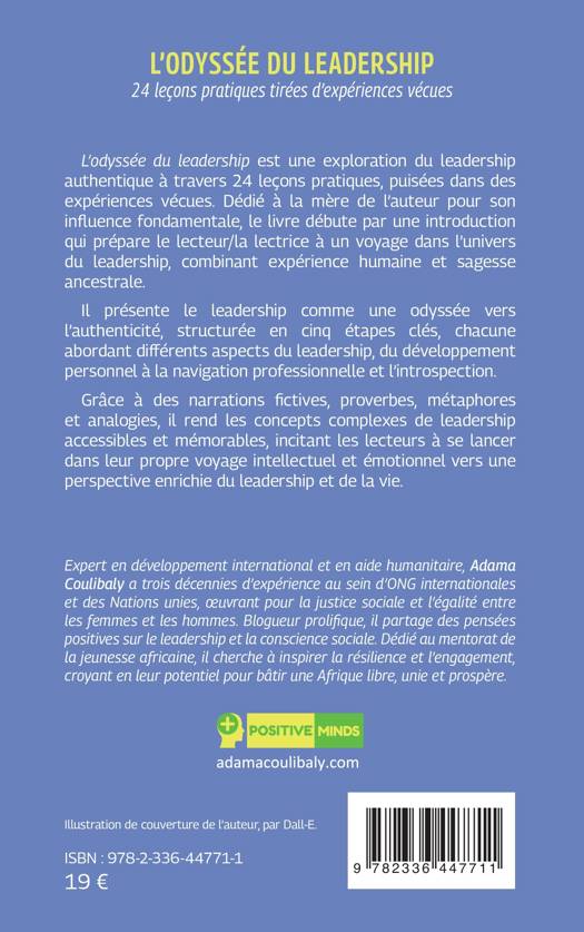 L’odyssée du leadership est une exploration du leadership authentique à travers 24 leçons pratiques, puisées dans des expériences vécues. Dédié à la mère de l’auteur pour son influence fondamentale, le livre débute par une introduction qui prépare le lecteur/la lectrice à un voyage dans l’univers du leadership, combinant expérience humaine et sagesse ancestrale. Il présente le leadership comme une odyssée vers l’authenticité, structurée en cinq étapes clés, chacune abordant différents aspects du leadership, du développement personnel à la navigation professionnelle et l’introspection. Grâce à des narrations fictives, proverbes, métaphores et analogies, il rend les concepts complexes de leadership accessibles et mémorables, incitant les lecteurs à se lancer dans leur propre voyage intellectuel et émotionnel vers une perspective enrichie du leadership et de la vie.