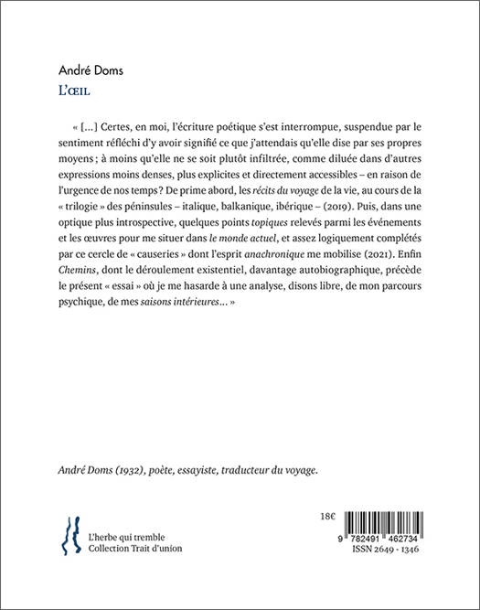 L’Œil, poursuit les réflexions d'andré Doms sur le monde actuel. Ses « essais », comme il les nomme : « [...] Certes, en moi, l’écriture poétique s’est interrompue, suspendue par le sentiment réfléchi d’y avoir signifié ce que j’attendais qu’elle dise par ses propres moyens ; à moins qu’elle ne se soit plutôt infiltrée, comme diluée dans d’autres expressions moins denses, plus explicites et directement accessibles – en raison de l’urgence de nos temps ? De prime abord, les récits du voyage de la vie, au cours de la « trilogie » des péninsules – italique, balkanique, ibérique – (2019). Puis, dans une optique plus introspective, quelques points topiques relevés parmi les événements et les œuvres pour me situer dans le monde actuel, et assez logiquement complétés par ce cercle de « causeries » dont l’esprit anachronique me mobilise (2021). Enfin Chemins, dont le déroulement existentiel, davantage autobiographique, précède le présent « essai » où je me hasarde à une analyse, disons libre, de mon parcours psychique, de mes saisons intérieures... »