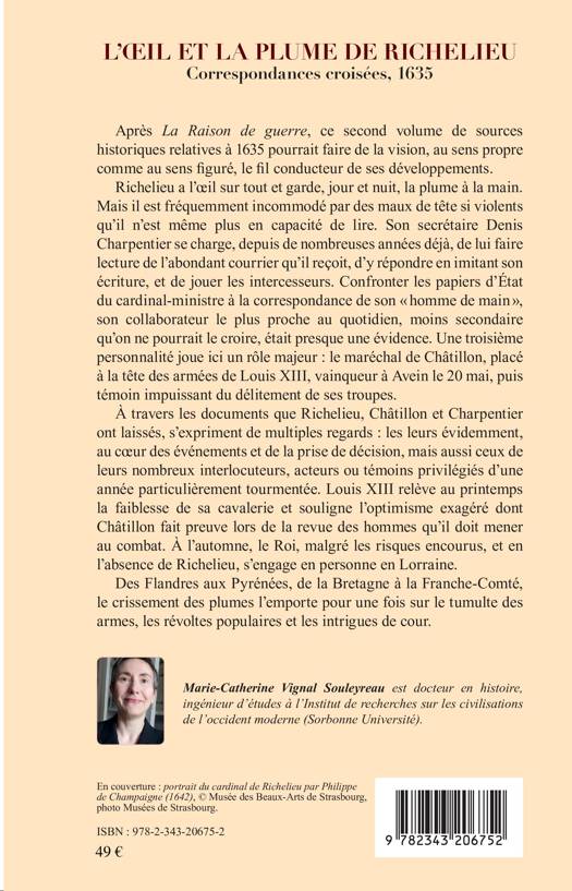 Après La Raison de guerre, ce second volume de sources historiques relatives à 1635 pourrait faire de la vision, au sens propre comme au sens figuré, le fil conducteur de ses développements. Richelieu a l'oeil sur tout et garde, jour et nuit, la plume à la main. Mais il est fréquemment incommodé par des maux de tête si violents qu'il n'est même plus en capacité de lire. Son secrétaire Denis Charpentier se charge, depuis de nombreuses années déjà, de lui faire lecture de l'abondant courrier qu'il reçoit, d'y répondre en imitant son écriture, et de jouer les intercesseurs.