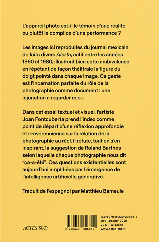 L'appareil photo est-il le témoin d'une réalité ou plutôt le complice d'une performance ? Les images ici reproduites du journal mexicain de faits divers Alerta, actif entre les années 1960 et 1980, illustrent bien cette ambivalence en répétant de façon théâtrale la figure du doigt pointé dans chaque image. Ce geste est l'incarnation parfaite du rôle de la photographie comme document : une injonction à regarder ceci. Dans cet essai textuel et visuel, l'artiste Joan Fontcuberta prend l'index comme point de départ d'une réflexion approfondie et irrévérencieuse sur la relation de la photographie au réel. Il réfute, tout en s'en inspirant, la suggestion de Roland Barthes selon laquelle chaque photographie nous dit "ça-a-été". Ces questions existentielles sont aujourd'hui amplifiées par l'émergence de l'intelligence artificielle générative.