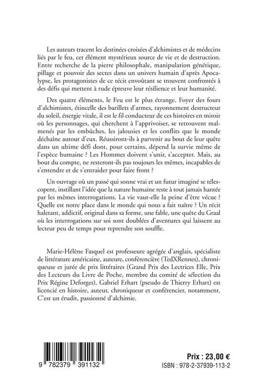 Les auteurs tracent les destinées d'alchimistes et de médecins liés par le feu. Les récits en miroir s'entremêlent pour témoigner de quêtes visant à rétablir un équilibre brisé. Les protagonistes, sortes de frères de sang malgré l'écart temporel, se retrouvent impliqués dans des aventures, confrontés à des mouvances et à des structures au sein d'une communautés largement privée de liberté. Ils se heurtent notamment à des sectes et à une répression omniprésente. Ces situations font écho à l’époque d’aujourd’hui, qui voit le tumulte et la domination technologique entraver la recherche de soi. Cet ouvrage met en scène de manière romancée l'histoire d'Arnaud et de son fils adoptif Nicolas, alchimistes, en quête de la pierre philosophale, dans un Moyen-Âge où règnent conflits et conspirations. En outre, dans un futur d’après Apocalypse, où la terre a brûlé, deux médecins tentent de créer des êtres humains génétiquement modifiés et capables de résister aux terribles conditions extérieures. Les deux auteurs charpentent avec une plume passionnante les destinées croisées d’alchimistes et de médecins liés par le Feu, cet élément mystérieux source de vie et de destruction. Des quatre éléments, le feu est le plus étrange. Foyer des fours d’alchimistes, étincelle des barillets d’armes, rayonnement destructeur du soleil, énergie vitale, le Feu est le fil conducteur des histoires en miroir de l’ouvrage où les personnages, qui cherchent à l’apprivoiser, se retrouvent malmenés par les embûches, les jalousies et les conflits que le monde déchaîne autour d’eux. Les auteurs offrent aux lecteurs une histoire où l’on retient son souffle, une sorte de quête où l’on brûle de deviner la fin avant d’y arriver. Un livre qui donne à penser et qui ouvre les voies d’une transmutation intrigante. Marie-Hélène Fasquel est professeure agrégée d'anglais, rennoise spécialiste de littérature américaine, auteure de plus de 14 ouvrages, conférencière (TedXRennes), chroniqueuse et jurée de prix littéraires (Grand Prix des Lectrices Elle en 2020, Prix des Lecteurs du Livre de Poche, membre du comité de sélection du Prix Régine Deforges en 2021). Titulaire de plusieurs prix dont celui de l’UNESCO pour son innovation, l’auteure a été élevée par Edouard Philippe à la dignité de Chevalier de l'ordre national du Mérite de la République. Gabriel Erhart est licencié en histoire, auteur de divers ouvrages, chroniqueur et conférencier, notamment. C’est un érudit, passionné d’alchimie, et un magicien de la musique qui enseigne le jazz. Navigateur, Gabriel Erhart s’est produit dans de nombreux festivals en France dans le Nord, et en Egypte, terre alchimique ancestrale.