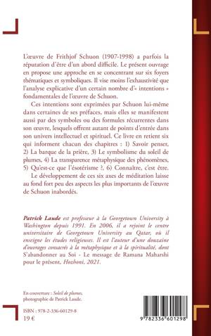L'oeuvre de Frithjof Schuon (1907-1998) a parfois la réputation d'être d'un abord difficile. Le présent ouvrage en propose une approche en se concentrant sur six foyers thématiques et symboliques. Il vise moins l'exhaustivité que l'analyse explicative d'un certain nombre d' intentions fondamentales de l'oeuvre de Schuon. Ces intentions sont exprimées par Schuon lui-même dans certaines de ses préfaces, mais elles se manifestent aussi par des symboles ou des formules récurrentes dans son oeuvre, lesquels offrent autant de points d'entrée dans son univers intellectuel et spirituel. Ce livre en retient six qui informent chacun des chapitres: 1) Savoir penser, 2) La barque de la prière, 3) Le symbolisme du soleil de plumes, 4) La transparence métaphysique des phénomènes, 5) Qu'est-ce que l'ésotérisme ?, 6) Connaître, c'est être. Le développement de ces six axes de méditation laisse au fond fort peu des aspects les plus importants de l'oeuvre de Schuon inabordés.