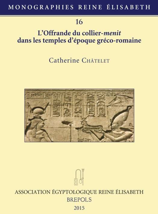 English summary: Menit necklace offering texts refer to two major events in Egyptian mythology: the luring of Tefnut back from the Nubian desert with the menit, and Horus's offering of the menit to the goddess. The present study offers a complete iconographic study of temple representations of the menit necklace, translations and analyses of relative texts, as well as a clear examination of the place of this object in Egyptian mythological and political representation. French description: Les textes d'offrande du collier-menit inscrits sur les parois des temples se referent a deux grands recits mythologiques: celui du mythe de la Lointaine ou le roi apaise la deesse dangereuse a son retour de Nubie au moyen de cette parure parfois associee aux sistres, et egalement celui d'Horus et Seth ou le roi, tel Horus, presente a la deesse un collier prenant alors la valeur des attributs du dieu Seth. L'etude de l'iconographie du collier, des couronnes portees par les divinites et par le roi, la traduction de l'ensemble des textes relatifs a cette offrande et leur analyse, qu'elle soit grammaticale, religieuse ou epigraphique, ont revele le role fondamental que jouait ce collier-menit: lorsqu'il est presente tel un objet sacre de la deesse Hathor, c'est la divinite qu'il incarne en etant le reflet de sa beaute, de sa brillance; lorsqu'il symbolise les testicules du dieu Seth, il est un moyen pour le roi de legitimer son pouvoir royal sur le trone du Double Pays. Enfin l'auteure s'est efforcee de prendre en consideration la composition du programme decoratif dans lequel cette offrande du collier-menit s'integre et de suggerer les correlations entre differentes scenes afin d'affiner la comprehension, autant que faire se peut, de l'offrande de cet objet a multiples facettes.