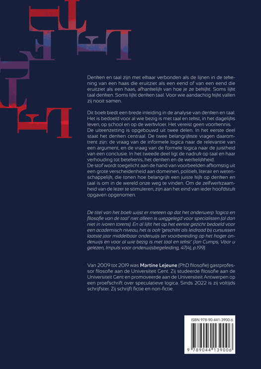 Dit boek biedt een brede inleiding in de analyse van denken en taal. Het is bedoeld voor al wie bezig is met taal en tekst, in het dagelijks leven, op school en op de werkvloer. Het vereist geen voorkennis. De uiteenzetting is opgebouwd uit twee delen. In het eerste deel staat het denken centraal. De twee belangrijkste vragen daaromtrent zijn: de vraag van de informele logica naar de relevantie van een argument, en de vraag van de formele logica naar de juistheid van een conclusie. In het tweede deel ligt de nadruk op taal en haar verhouding tot betekenis, het denken en de werkelijkheid. De stof wordt toegelicht aan de hand van voorbeelden afkomstig uit een grote verscheidenheid aan domeinen, politiek, literair en wetenschappelijk, die tonen hoe belangrijk een juiste kijk op denken en taal is om in de wereld onze weg te vinden. Om de zelfwerkzaamheid van de lezer te stimuleren, zijn aan het eind van ieder hoofdstuk opgaven opgenomen.