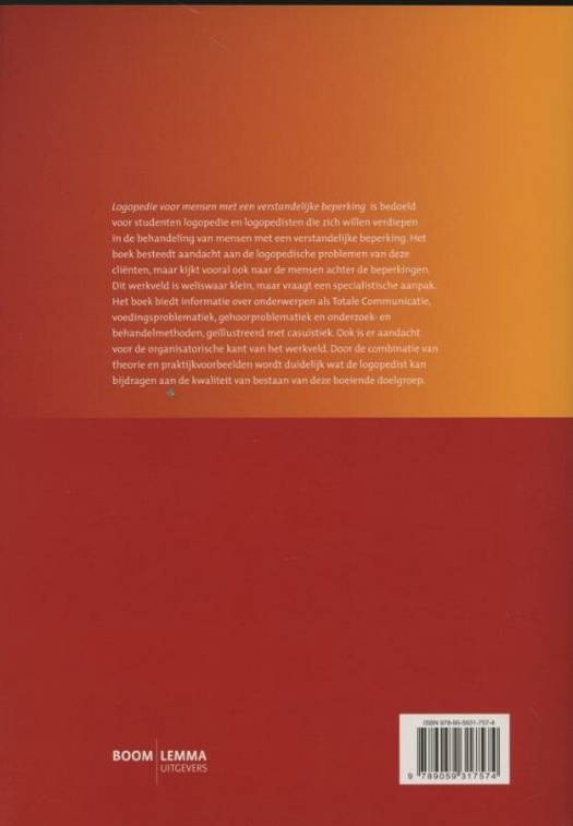 Logopedie voor mensen met een verstandelijke beperking is bedoeld voor studenten logopedie en logopedisten die zich willen verdiepen in de behandeling van mensen met een verstandelijke beperking. Het boek besteedt aandacht aan de logopedische problemen van deze cliënten, maar kijkt vooral ook naar de mensen achter de beperkingen. Dit werkveld is weliswaar klein, maar vraagt een specialistische aanpak. Het boek biedt informatie over onderwerpen als Totale Communicatie, voedingsproblematiek, gehoorproblematiek en onderzoek- en behandelmethoden, geïllustreerd met casuïstiek. Ook is er aandacht voor de organisatorische kant van het werkveld. Door de combinatie van theorie en praktijkvoorbeelden wordt duidelijk wat de logopedist kan bijdragen aan de kwaliteit van bestaan van deze boeiende doelgroep.