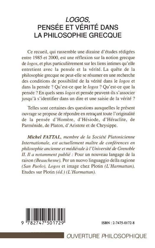 Ce recueil constitue une réflexion sur la notion grecque de logos. Qu'est-ce que le logos ? Qu'est-ce que la pensée ? En quels sens logos et pensée peuvent-ils s'associer jusqu'à s'identifier dans un dire et une saisie de la vérité ? L'auteur apporte un essai de réponse à ces questions en retraçant toute l'originalité de la pensée d'Homère, d'Hésiode, d'Héraclite, de Parménide, de Platon, d'Aristote et de Chrysippe.