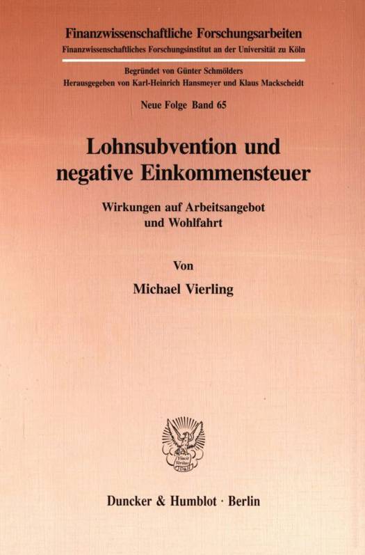 Ausgangspunkt der vorliegenden Arbeit ist der noch erhebliche Bedarf an theoretischer Forschung zu den Wirkungen, die von der Lohnsubvention als transferpolitischem Instrument und ihren möglichen Alternativen ausgehen: Im Mittelpunkt der Analyse steht die Lohnsubvention, verstanden als Lohnsatzsubvention, und ihre Wirkungen auf Arbeitsangebot und Wohlfahrt.