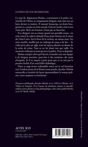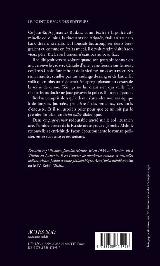 Ce jour-là, Algimantas Butkus, commissaire à la police criminelle de Vilnius, la cinquantaine fatiguée, était assis sur un banc devant sa maison. Il toussait beaucoup, ses dents bougeaient et, comme on était samedi, il devait rendre visite à son vieux père. Bref, son humeur n'était pas au beau fixe. Il se dirigeait vers sa voiture quand son portable sonna : on avait trouvé le cadavre dénudé d'une jeune femme sur le mont des Trois Croix. Sur le front de la victime, un oiseau mort. Ses seins mutilés, souillés par un mélange de sang et de lait... Et voilà qu'en plus un aigle avait été aperçu planant au-dessus de la scène de crime. Tout ça ne lui disait rien qui vaille. Un meurtrier ordinaire ne joue pas avec la police. Il tue et disparaît. Butkus comprit alors qu'il devait s'attendre avec son équipe à de longues journées, peut-être à des semaines, des mois d'enquête. Et il se surprit à prier pour que ce ne soit pas le premier forfait d'un serial killer diabolique. Dans ce page-turner redoutable ancré sur le sol lituanien avec l'ombre portée de la Russie toute proche, Jaroslav Melnik renouvelle et enrichit de façon époustouflante le roman policier, entre suspense et ésotérisme.