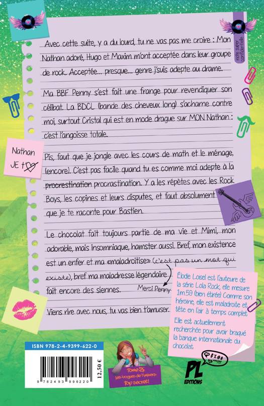 Avec cette suite, y a du lourd, tu ne vas pas me croire :Mon Nathan adoré, Hugo et Maxime m’ont acceptée dans le groupe de rock. Acceptée... presque... genre j’suis adepte au drame.Ma BBF Penny s’est fait une frange pour revendiquer son célibat. La BDCL (Bande Des Cheveux Long) s’acharne contre moi et carrément Cristal en mode drague sur MON Nathan : C’est l’angoisse totale.Pis, faut que je jongle avec les cours de math et le ménage, (encore) c’est pas facile quand tu es comme moi adepte à la procrestination procrastination. Y a les répètes avec les Rock Boys, les copines et leurs disputes, et faut absolument que je te raconte pour Bastien.Le chocolat fait toujours partie de ma vie et Mimi, mon adorable, mais insomniaque, hamster aussi. Bref, mon existence est un enfer et ma «maladroitise» (c’est pas un mot qui existe (écriture de Penny)), bref ma maladresse légendaire fait encore des siennes.