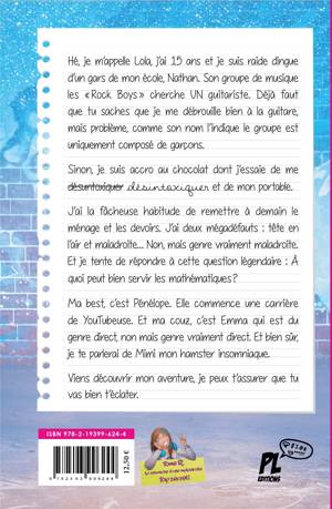Hé, je m’appelle Lola, j’ai 15 ans et je suis raide dingue d’un gars de mon école, Nathan. Son groupe de musique les «Rock Boys» cherche UN guitariste. Déjà faut que tu saches que je me débrouille bien à la guitare, mais problème, comme son nom l’indique le groupe est uniquement composé de garçons.Sinon, je suis accro au chocolat dont j’essaie de me désuntoxiquer désintoxiquer et de mon portable. J’ai la fâcheuse habitude de remettre à demain le ménage et les devoirs. J’ai deux mégadéfauts : tête en l’air et maladroite... Non, mais genre vraiment maladroite. Et je tente de répondre à cette question légendaire : À quoi peut bien servir les mathématiques? Ma best, c’est Pénélope. Elle commence une carrière de YouTubeuse. Et ma couz, c’est Emma qui est du genre direct, non mais genre vraiment direct. Et bien sûr, je te parlerai de Mimi mon hamster insomniaque.Viens découvrir mon aventure, je peux t’assurer que tu vas bien t’éclater !