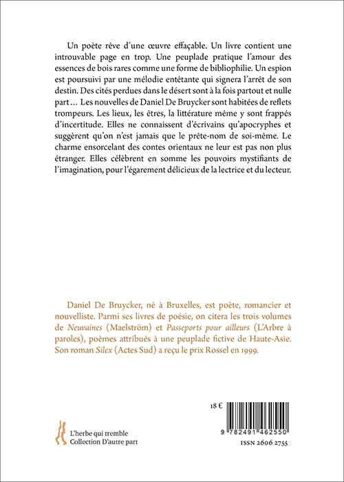 Un poète rêve d’une œuvre effaçable. Un livre contient une introuvable page en trop. Une peuplade pratique l’amour des essences de bois rares comme une forme de bibliophilie. Un espion est poursuivi par une mélodie entêtante qui signera l’arrêt de son destin. Des cités perdues dans le désert sont à la fois partout et nulle part… Les nouvelles de Daniel De Bruycker sont habitées de reflets trompeurs. Les lieux, les êtres, la littérature même y sont frappés d’incertitude. Elles ne connaissent d’écrivains qu’apocryphes et suggèrent qu’on n’est jamais que le prête-nom de soi-même. Le charme ensorcelant des contes orientaux ne leur est pas non plus étranger. Elles célèbrent en somme les pouvoirs mystifiants de l’imagination, pour l’égarement délicieux de la lectrice et du lecteur.