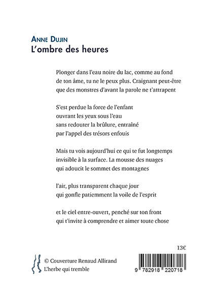 L’ombre des heures est le premier recueil d'Anne Dujin. Mère et poète. Ses poèmes, interrogent le langage, révèlent sans que cela soit une dénonciation, les multiples masques que peuvent revêtir les mots. Si la poète tente de remonter à la source des mots, et d’en démêler les sens qui arpentent nos existences, elle sait où trouver plénitude, beauté, de façon instantanée, intuitive : dans la simple observation de la vie, celle qu'on touche, qui nous touche, et dont l'une des sources est dans l'enfance, la lumière des enfants. À la difficulté de répondre aux interrogations intimes :