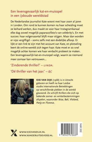 In de huiveringwekkende thriller Londen van bestsellerauteur Kiki van Dijk, bekend van o.a. thrillers als Parijs, Vlieland en Florence, woont de Nederlandse journalist Kate al jaren met haar zoon in Londen. Om rond te kunnen komen na haar scheiding moet ze keihard werken, dus maakt ze voor haar Instagramkanaal elke dag zoveel mogelijk paparazzifoto’s van celebrity’s. En met succes: haar volgersaantal blijft maar stijgen. Maar dan worden er vips vergiftigd – soms zelfs met een dodelijke afloop. Er lijkt er een link te zijn met het account van Kate, en plotseling keert de online-wereld zich tegen haar. Kate moet er zo snel mogelijk achter komen wie haar verdacht probeert te maken. Een levensgevaarlijk kat-en-muisspel volgt, waarin ze niemand meer zomaar kan vertrouwen...