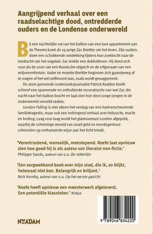 Bij een nachtelijke val van het balkon van een luxe appartement aan de Theems komt de 19-jarige Zac Brettler om het leven. Zijn ouders doen een schokkende ontdekking tijdens hun zoektocht naar de toedracht van het ongeluk: Zac leidde een dubbelleven. Hij deed zich voor als de zoon van een Russische oligarch en de erfgenaam van een miljoenenenfortuin. Vader en moeder Brettler beginnen zich gaandeweg af te vragen of het wel zelfmoord was, zoals wordt gesuggereerd. De alom geroemde onderzoeksjournalist Patrick Radden Keefe schreef een spannende en onthullende reconstructie van wat Zac die nacht naar het balkon bracht en laat zien hoe deze jonge jongen in de onderwereld verzeild raakte. London Falling is niet alleen het verslag van een hartverscheurende familietragedie, maar ook een indringend verhaal over hebzucht, macht en bedrog. Laag voor laag wordt het glamoureuze Londen afgepeld, waarbij de schimmige wereld van zwart geld en meedogenloze criminelen op onthutsende wijze aan het licht treedt.