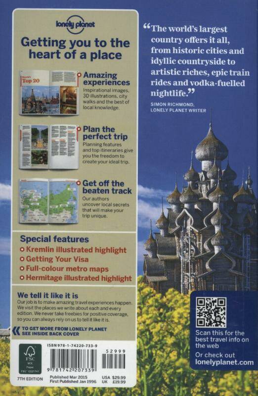 Inside Lonely Planet's Russia Travel Guide: *Colour maps and images throughout *Highlights and itineraries help you tailor your trip to your personal needs and interests *Insider tips to save time and money and get around like a local, avoiding crowds and trouble spots *Essential info at your fingertips - hours of operation, phone numbers, websites, transit tips, prices *Honest reviews for all budgets - eating, sleeping, sight-seeing, going out, shopping, hidden gems that most guidebooks miss *Cultural insights give you a richer, more rewarding travel experience - history, politics, literature, cinema, religion, performing arts, music, visual art, architecture, cuisine, landscapes, wildlife. *Over 80 maps *Covers Moscow, St Petersburg, the Golden Ring, Kaliningrad, European Russia, the Volga Region, the Russia Caucasus, Sochi, Lake Baikal, the Urals, Yekaterinburg, Siberia, Irkutsk, Vladivostok, Kamchatka and more
