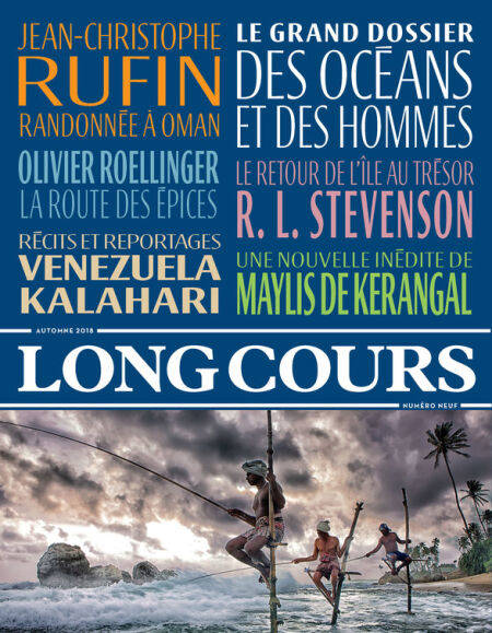 Pour son grand retour en librairie, le premier mook de voyage propose un dossier « au long cours » consacré aux mers et aux océans, sous tous les angles : un récit exclusif de Maylis de Kerangal sur les « capitaines de sa vie », un embarquement aux côtés des écrivains de marine par Olivier Frébourg, une enquête sur le voyage de La Pérouse en Alaska, une transatlantique infernale de Lisbonne à Recife, le monde sous-marin raconté par la romancière Estelle Nollet et un grand entretien avec le chef voyageur Olivier Roellinger. La revue vous embarque également dans un grand tour du monde terrestre avec un récit de voyage exclusif signé Jean-Christophe Rufin, « Randonnées à Oman », illustré avec ses photos. – Le quotidien des habitants du Venezuela en temps de crise, raconté par Bénédicte Martin. – L’histoire des Dardanelles revisitée par l’écrivain voyageur italien Paolo Rumiz. – De sublimes images de la route de la Soie par le grand photographe japonais Kishin Shinoyama. – Une nouvelle inédite d’Alexandre Kauffmann, « Quand viendra la pluie du Kalahari ». – Un extrait de la nouvelle traduction de "L'Île au trésor" de Stevenson – Les aventures d’André Malraux en Indochine… Sans oublier une nouvelle inédite de Jean-Luc Coatalem illustrée par Loustal.