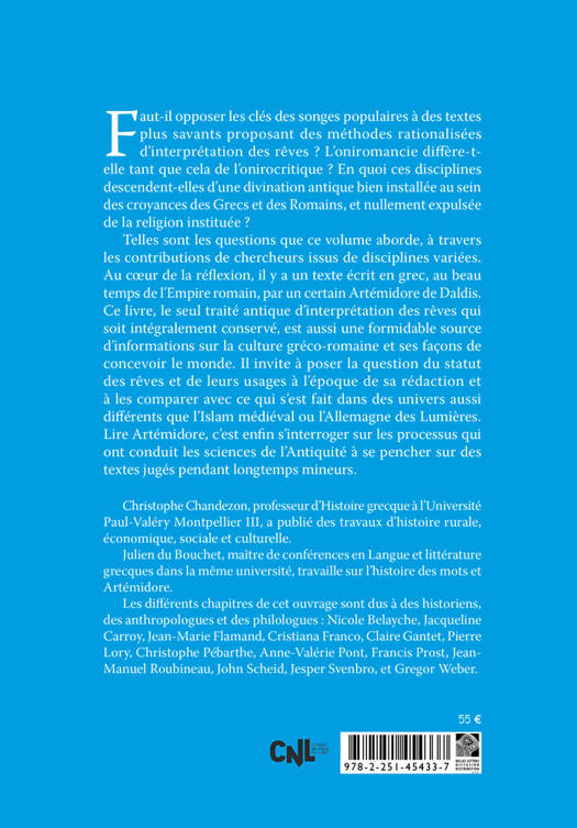 Faut-il opposer les cles des songes populaires a des textes plus savants proposant des methodes rationalisees d'interpretation des reves ? L'oniromancie differe-telle tant que cela de l'onirocritique ? En quoi ces disciplines descendent-elles d'une divination antique bien installee au sein des croyances des Grecs et des Romains, et nullement expulsee de la religion instituee ? Telles sont les questions que ce volume aborde, a travers les contributions de chercheurs issus de disciplines variees. Au coeur de la reflexion, il y a un texte ecrit en grec, au beau temps de l'Empire romain, par un certain Artemidore de Daldis. Ce livre, le seul traite antique d'interpretation des reves qui soit integralement conserve, est aussi une formidable source d'informations sur la culture greco-romaine et ses facons de concevoir le monde. Il invite a poser la question du statut des reves et de leurs usages a l'epoque de sa redaction et a les comparer avec ce qui s'est fait dans des univers aussi differents que l'Islam medieval ou l'Allemagne des Lumieres. Lire Artemidore, c'est enfin s'interroger sur les processus qui ont conduit les sciences de l'Antiquite a se pencher sur des textes juges pendant longtemps mineurs.