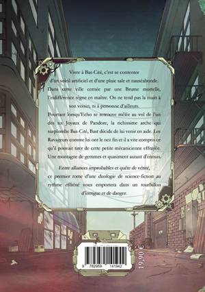 Vivre à Bas-Cité, c’est se contenter d’un soleil artificiel et d’une pluie sale et nauséabonde. Dans cette ville cernée par une Brume mortelle, l’indifférence règne en maître. On ne tend pas la main à son voisin, ni à personne d’ailleurs. Pourtant lorsqu’Echo se retrouve mêlée au vol de l’un des six Joyaux de Pandore, la richissime arche qui surplombe Bas-Cité, Bast décide de lui venir en aide. Les Ravageurs comme lui ont le nez fin et il a vite compris ce qu’il pouvait tirer de cette petite mécanicienne effrayée. Une montagne de gemmes et quasiment autant d’ennuis. Entre alliances improbables et quête de vérité, ce premier tome d’une duologie de science-fiction au rythme effréné vous emportera dans un tourbillon d’intrigue et de danger.