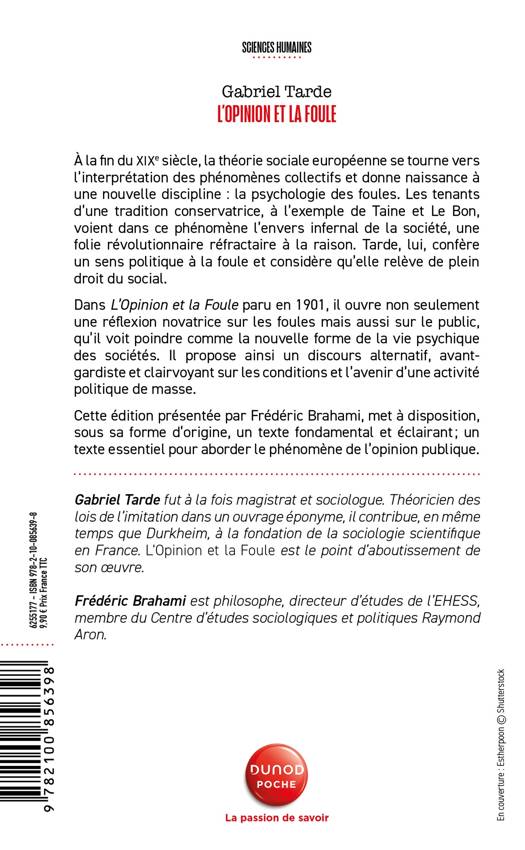 A la fin du XIXe siècle, la théorie sociale européenne se tourne vers l'interprétation des phénomènes collectifs. Une nouvelle discipline est née : la "psychologie des foules". Ses fondateurs comme ses représentant attitrés qui appartiennent à la science française et italienne trouvent très vite un large écho dans toute l'Europe. C'est précisément Gabriel Tarde qui en construisant une théorie des systèmes sociaux modernes fondée non plus sur la "foule", mais sur le concept de "public", saura proposer le premier discours alternatif sur les conditions et l'avenir d'une activité politique de masse non violente. Dans le même temps, son grand livre "L'Opinion et la Foule" servira de point de départ à une nouvelle tradition théorique.