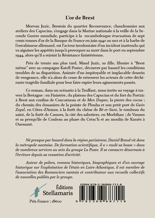 Morvan Juzic, Brestois du quartier Recouvrance, chaudronnier aux ateliers des Capucins, s’engage dans la Marine nationale à la veille de la Seconde Guerre mondiale, participe à la rocambolesque évacuation de sept cents tonnes d’or de la Banque de France en juin 1940 au nez et à la barbe de l’envahisseur allemand, est l’acteur involontaire d’un incident inattendu qui va aiguiser les appétits jusqu’à provoquer sa mort dans le port en septembre 1944, alors qu’il a rejoint la Résistance finistérienne. Près de trente ans plus tard, Maud Juzic, sa fille, libraire à “Brest même” avec sa compagne Katell Postec, découvre par hasard les conditions troubles de sa disparition. Animée d’un impitoyable et implacable dessein de vengeance, elle n’a alors de cesse de retrouver les acteurs de cette déchirante tragédie familiale pour leur faire expier leurs agissements passés. Ce roman, dans un scénario à la Truffaut, nous invite au voyage à travers la Bretagne : en Finistère, du plateau des Capucins et du fort du Portzic à Brest aux confins de Concarneau et de Men Dogan, la pierre des cocus ; du chemin des douaniers de la pointe de Plouha et son petit port de Gwin Zegal, en Côtes-d’Armor, à la forêt du chêne de Bé-er-Sant, le tombeau du saint, de la forêt de Camors, la cité des sabotiers, en Morbihan ; de Vannes et sa presqu’île de Conleau au phare du Créac’h et au moulin de Karaës à Ouessant.