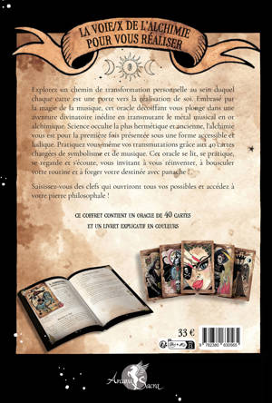 Explorez un chemin de transformation personnelle au sein duquel chaque carte est une porte vers la réalisation de soi. Embrasé par la magie de la musique, cet oracle décoiffant vous plonge dans une aventure divinatoire inédite en transmutant le métal musical en or alchimique. Science occulte la plus hermétique et ancienne, l’alchimie vous est pour la première fois présentée sous une forme accessible et ludique. Pratiquez vous-même vos transmutations grâce aux 40 cartes chargées de symbolisme et de musique. Cet oracle se lit, se pratique, se regarde et s’écoute, vous invitant à vous réinventer, à bousculer votre routine et à forger votre destinée avec panache ! Saisissez-vous des clefs qui ouvriront tous vos possibles et accédez à votre pierre philosophale !