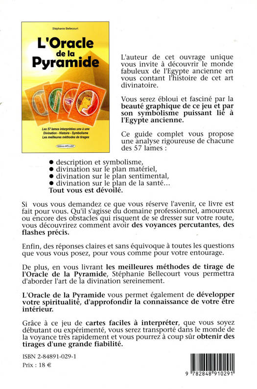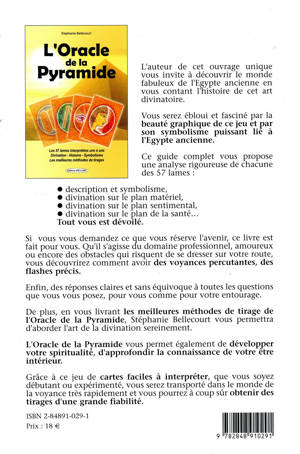 L'auteur de cet ouvrage unique vous invite à découvrir le monde fabuleux de l'Egypte ancienne en vous contant l'histoire de cet art divinatoire. Vous serez ébloui et fasciné par la beauté graphique de ce jeu et par son symbolisme puissant lié à l'Egypte ancienne. Ce guide complet vous propose une analyse rigoureuse de chacune des 57 lames : description et symbolisme, divination sur le plan matériel, divination sur le plan sentimental, divination sur le plan de la santé... Tout vous est dévoilé. Si vous vous demandez ce que vous réserve l'avenir, ce livre est fait pour vous. Qu'il s'agisse du domaine professionnel, amoureux ou encore des obstacles qui risquent de se dresser sur votre route, vous découvrirez comment avoir des voyances percutantes, des flashes précis. Enfin, des réponses claires et sans équivoque à toutes les questions que vous vous posez, pour vous comme pour votre entourage. De plus, en vous livrant les meilleures méthodes de tirage de l'Oracle de la Pyramide, Stéphanie Bellecourt vous permettra d'aborder l'art de la divination sereinement. L'Oracle de la Pyramide vous permet également de développer votre spiritualité, d'approfondir la connaissance de votre être intérieur. Grâce à ce jeu de cartes faciles à interpréter, que vous soyez débutant ou expérimenté, vous serez transporté dans le monde de la voyance très rapidement et vous pourrez à coup sûr obtenir des tirages d'une grande fiabilité.